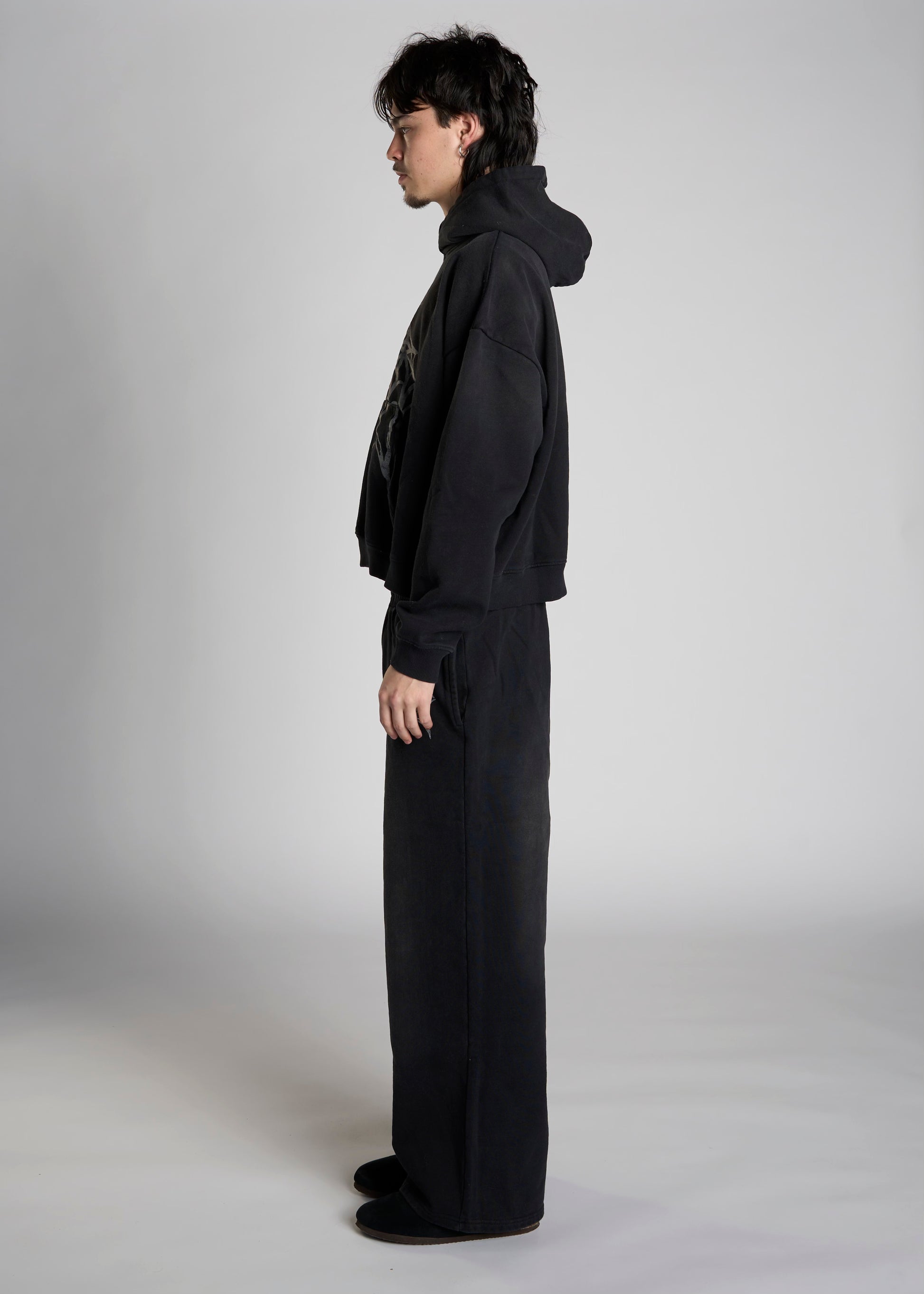 The Revival sweatpants are apart of the Revival sweatsuit . The sweatsuit symbolizes the rise from hell symbolically. Rising out of hard times in your life and becoming stronger because having gone through them. The sweatpants feature the Revival web logo on the front left pant leg. The pants are wide leg 420 GSM, with an elastic waistband for a comfortable fit. The pants feature a washed black colour way and can seamlessly fit Into your pant rotation.